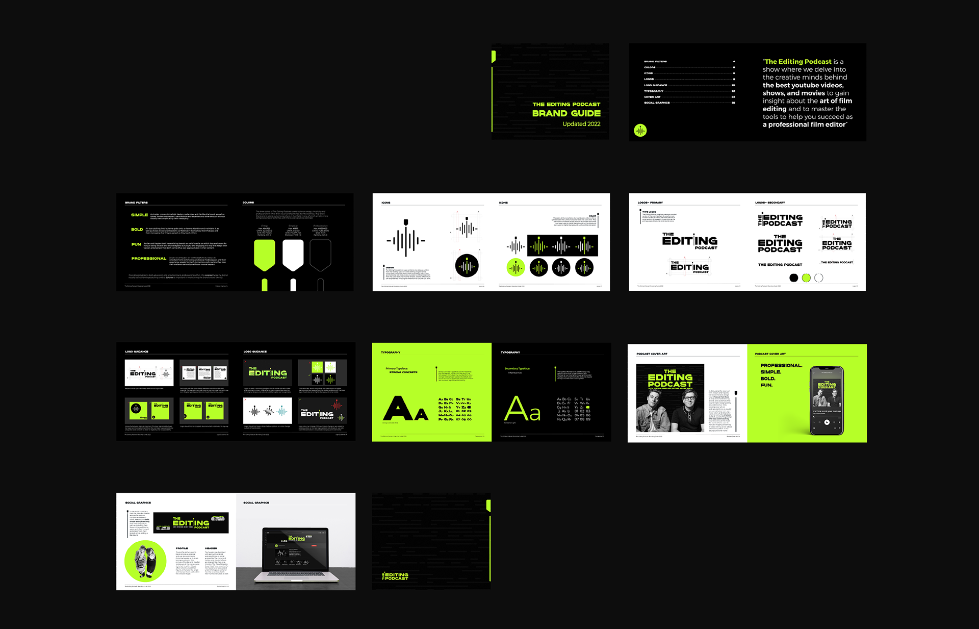 Jordan and Hayden are professional video editors who have worked on projects for musicians like Justin Bieber and YouTubers like Mr. Beast. Wanting to share their knowledge and industry experience with aspiring editors, they started a podcast. They wanted professional, minimalistic, and striking branding with logos, podcast cover art and startup YouTube graphics that clearly identified them as editors. Their logos were modeled after video editing markers, and their cover art features imagery similar to that of the timeline in a video editing software, with a bold, high contrast color scheme to convey professionalism and energy.